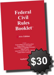 Our Federal Civil Rules Booklet has all the essential Federal court rules: Civil Procedure, Evidence, Appellate, Admiralty, Official Forms, plus key provisions in Title 28. It is compact, light weight, and a fraction of the cost of other publications. Now shipping.